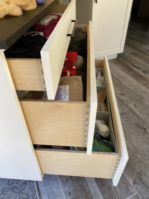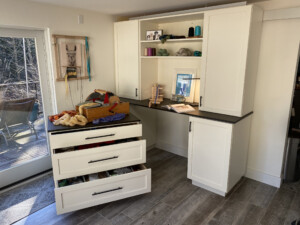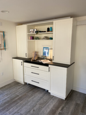 This client wanted to update the cabinetry in this space, and it turned out to be a very comfortable and multifunctional room. The large shelf above the desk has lighting embedded on the bottom, providing light across the entire work surface, and the dimmable feature of the lighting makes the space comfortable to use anytime of the day. The craft cabinet serves as an additional work area when the rolling drawer bank is moved to the center of the room. This rolling cabinet becomes an island which is super functional when working on projects, and the clients are also able to roll it into other spaces such as the kitchen when needed for holiday baking or cooking needs.